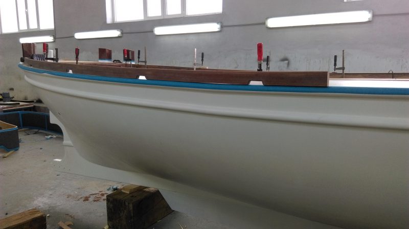 Next to go on is the toe rail, again made from mahogany and also coated with WEST SYSTEM 105 Epoxy Resin mixed with 207 Special Coating hardener to give that rich deep gloss. Note the drain holes.